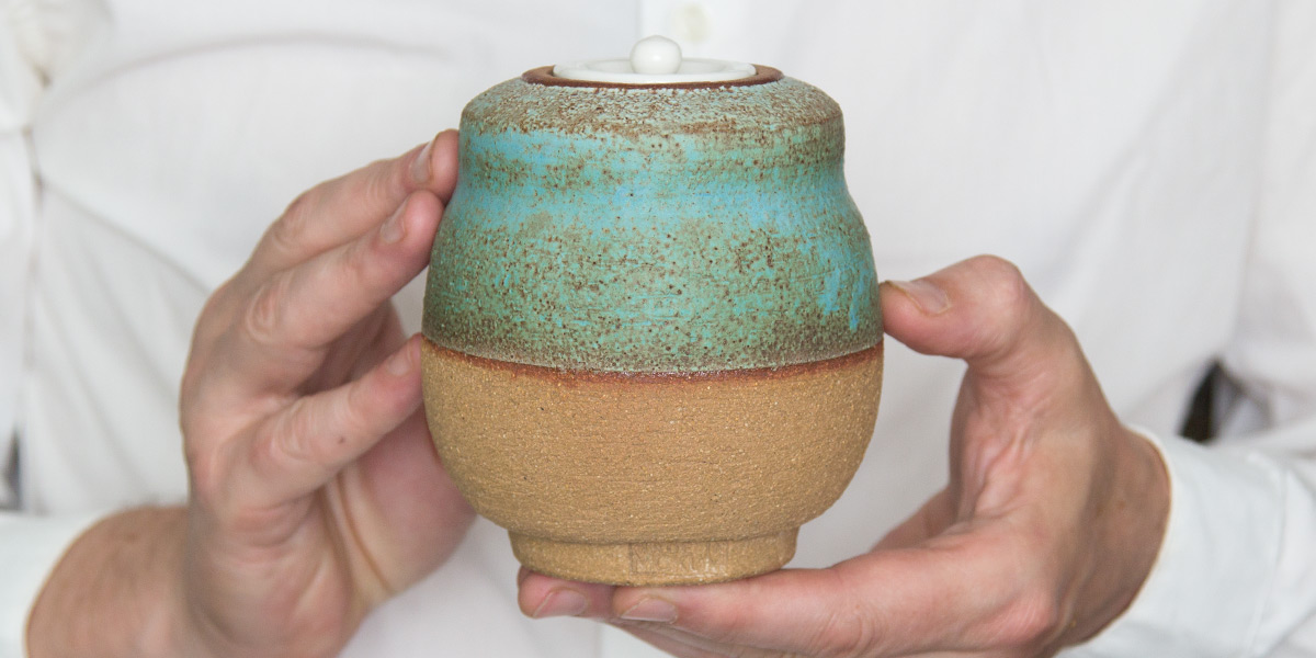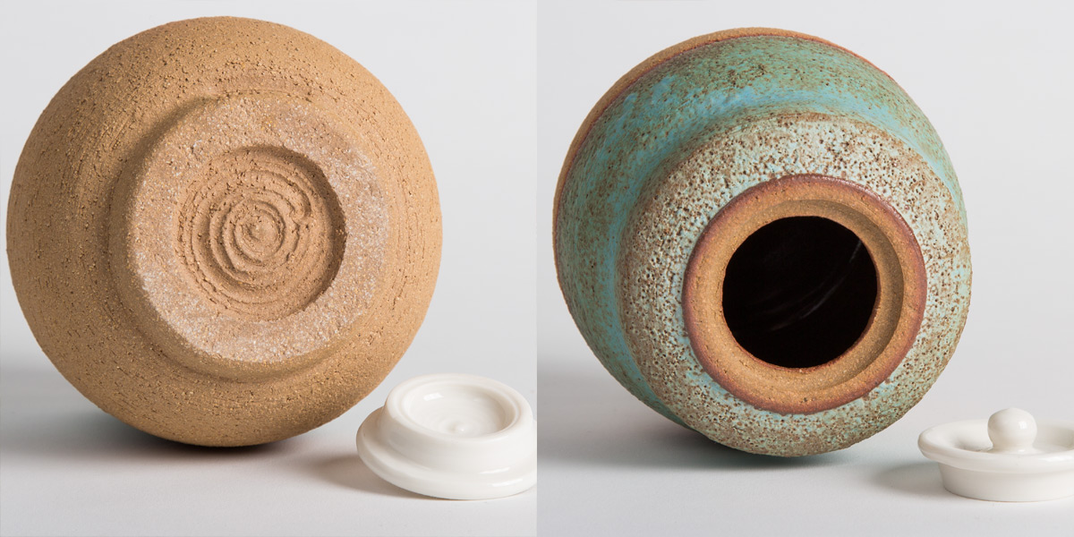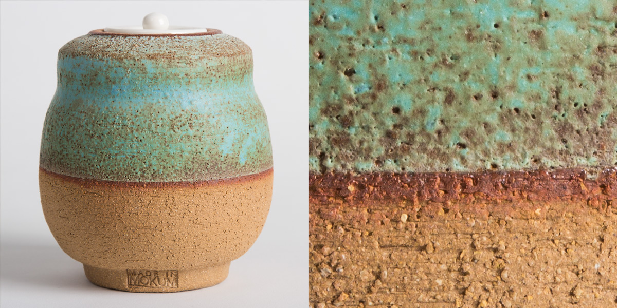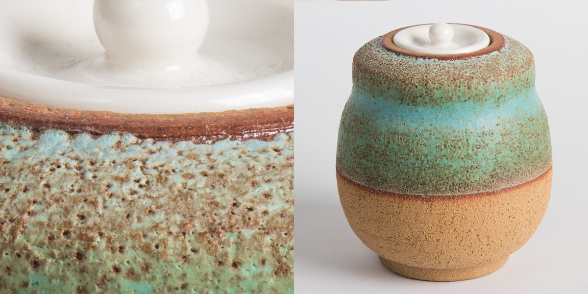 Copernio is one of our matcha-series. Based on Japanese matcha boxes but with a porcelain lid, instead of ivory. The clay is rough and covered in a blueish green mat glaze. We love how his shoulders are straight but his belly is bulging. Just like ourselves...