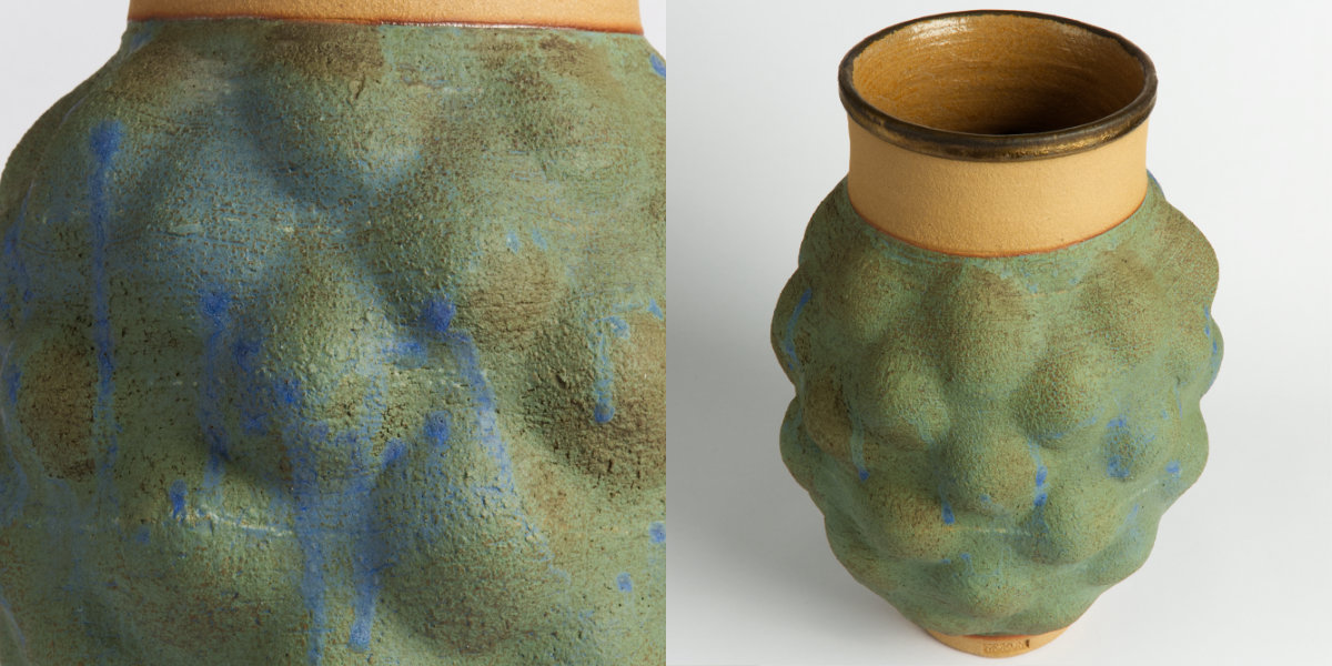 Now Isiah and Tucker started out as two brothers, but with such a different finish! Isiah is green and blue and brown… the matte glaze surprisingly goes towards the color that you combine him with! And the inside is not dark but light ochre, with a nice bronze rim as well. A nice tall neck on a tall vase. Perfect!